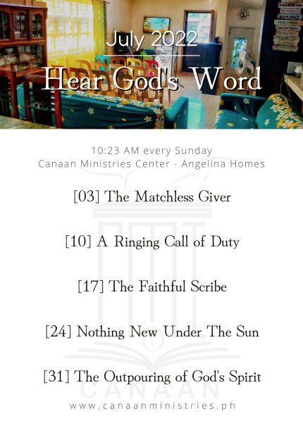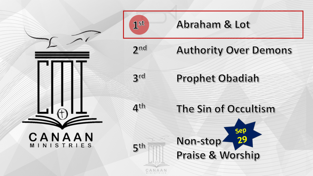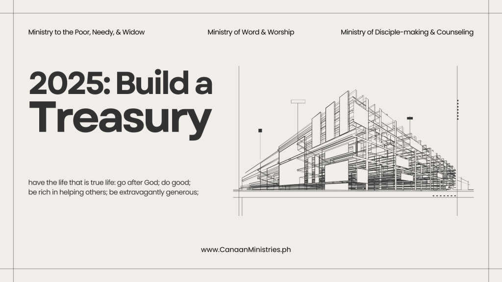 2025: Build a Treasury | have the life that is true life go after God; do good; be rich in helping others; be extravagantly generous;We are available to those seeking support for anxiety, depression, relationship issues, or personal growth. Consult now connect@canaanministries.phCome and hear God’s message this August: Abraham & Lot [Aug 4], Authority Over Demons [Aug 11], Prophet Obadiah [August 18], and The Sin of Occultism [Aug 25]. Every Sunday 10:23AM join in-person at Canaan Ministries Center – Angelina Homes or via Facebook LiVE at facebook.com/CanaanMinistriesPHScripture Guide for 2024 Prayer & Fasting