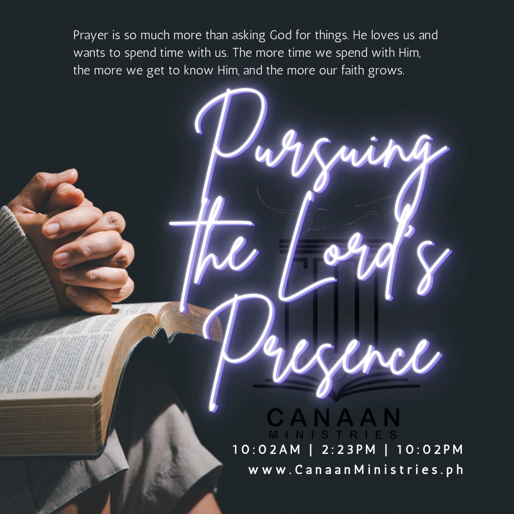 hurry! limited seats only. contact connect@canaanministries.phPursuing the Lord’s Presence: Prayer is so much more than asking God for things. He loves us and wants to spend time with us. The more time we spend with Him, the more we get to know Him, and the more our faith grows. 10:02AM | 2:23PM | 10:02PM